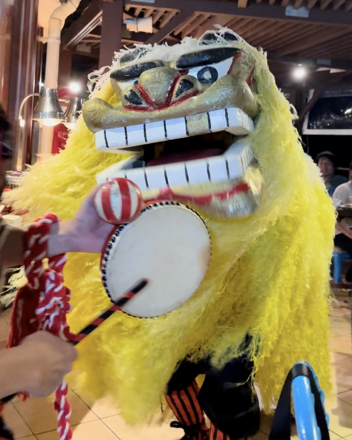 テーブルには沖縄料理がずらりと並び、カラフルなシーサーや装飾が南国ムードを盛り上げます。