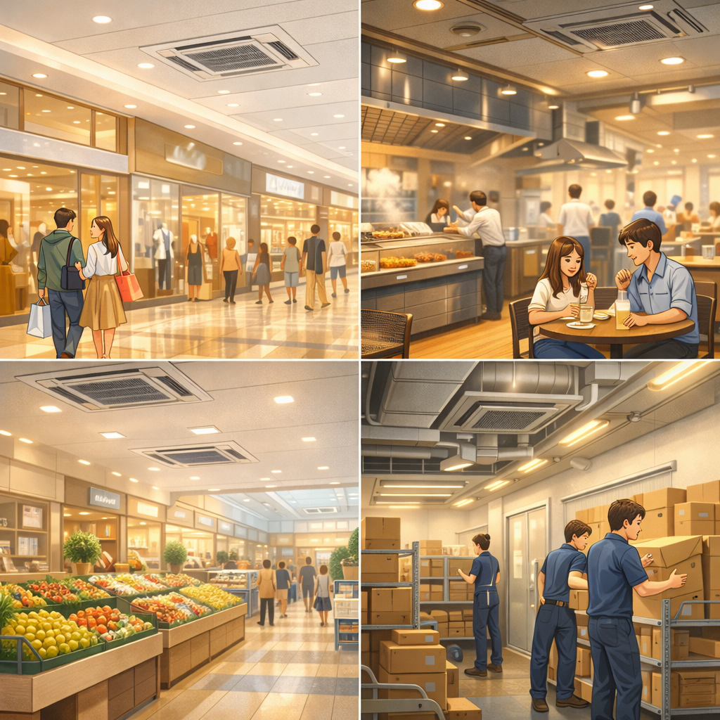 食品売り場、通路、飲食店など、同じ施設内でも環境に合わせた調整が必要になります。
